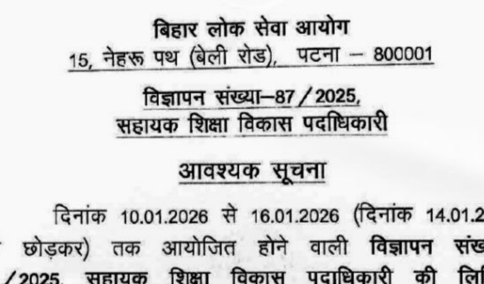 BPSC AEDO Exam 2025 : बिहार लोक सेवा आयोग (बीपीएससी) ने सहायक शिक्षा विकास पदाधिकारी (Assistant Education Development Officer – AEDO) की लिखित प्रतियोगिता परीक्षा को अपरिहार्य कारणों से स्थगित कर दिया है। यह परीक्षा विज्ञापन संख्या 87/2025 के तहत आयोजित की जानी थी। आयोग द्वारा जारी आधिकारिक नोटिस में यह जानकारी दी गई है कि 10 जनवरी 2026 से 16 जनवरी 2026 तक (14 जनवरी 2026 को छोड़कर) निर्धारित सभी तिथियों की परीक्षा स्थगित की जाती है।