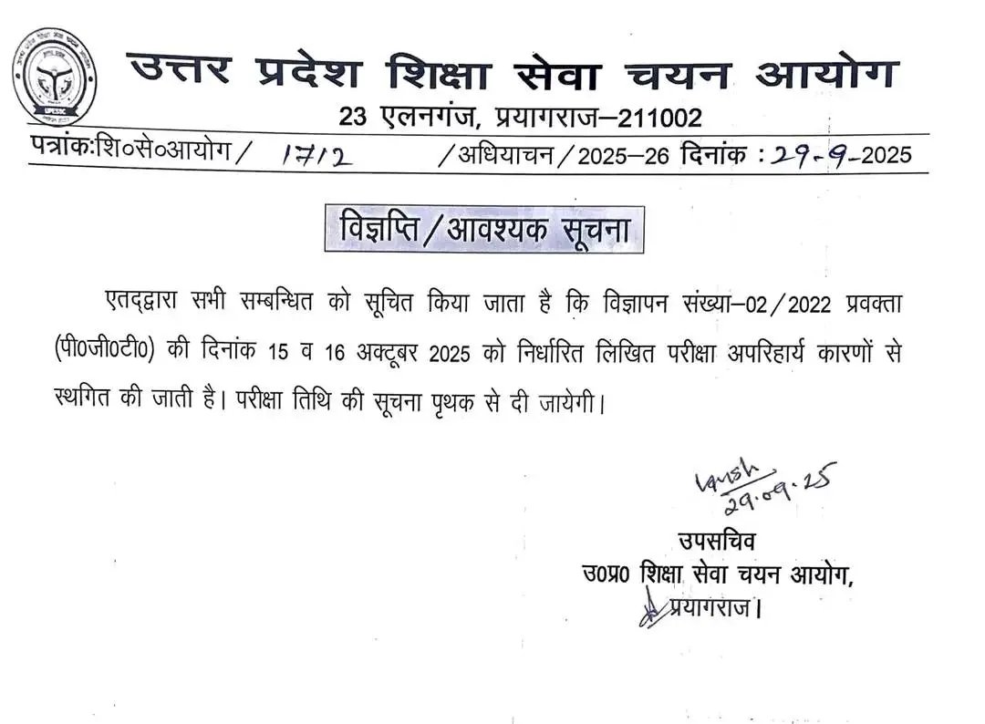 टीजीटी परीक्षा स्थगित कर दी गई हैं इससे पहले उत्तर प्रदेश शिक्षा सेवा चयन आयोग द्वारा यूपी पीजीटी परीक्षा अक्टूबर माह में और यूपी टीजीटी परीक्षा दिसंबर माह में प्रस्तावित थी। अब PGT परीक्षा स्थगित हो चुकी हैं। उत्तर प्रदेश शिक्षक पात्रता परीक्षा UP TET EXAM जनवरी 2026 के अंतिम सप्ताह में प्रस्तावित है। 29 और 30 जनवरी 2026 को उत्तर प्रदेश शिक्षक पात्रता परीक्षा प्रस्तावित हैं किन्तु अभी तक नोटिफिकेशन जारी नहीं किया जा सका है।